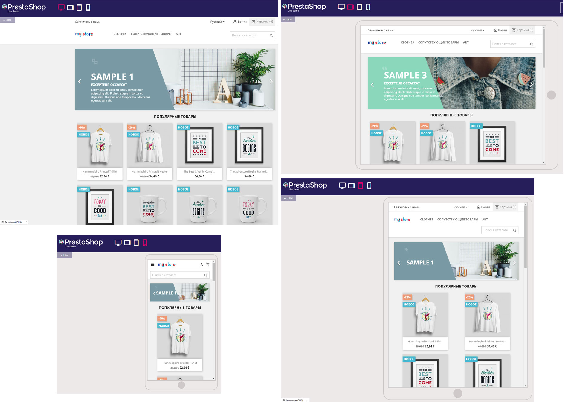 В верхней панели окна Вы можете выбирать, как будет смотреть типовой магазин для специального устройства: ПК, планшет, телефон.